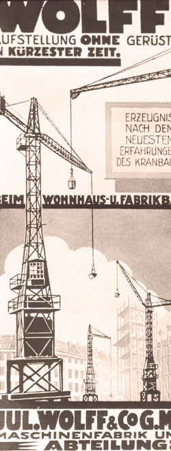 Las grúas torre empezaron a producirse en Europa a principios del siglo XX, debido a la angostura de sus calles, por lo que las grúas con “booms” y con el operador probaron tener ventajas en la obra. El resultado fue que los primeros fabricantes de grúas torre proceden del viejo continente, siendo pionera la fábrica Maschinenfabrik Julius Wolf & Co. que introdujo la primera serie de grúas torre en 1908, diseñadas específicamente para la industria de la construcción.